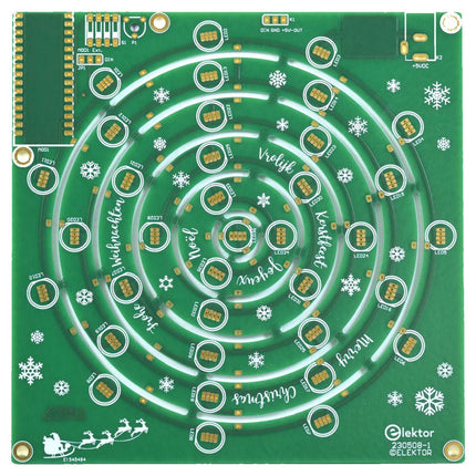 Multilingual DIY Kit (incl. 27 RGB LEDs + Raspberry Pi Pico) Bring some engineering magic to your festive season with the Wordy LED Christmas Tree, a unique DIY electronics kit designed by Elektor. This beautifully engineered 3D Christmas tree combines eleven PCBs, a Raspberry Pi Pico, and 27 addressable RGB LEDs to illuminate Christmas greetings in seven languages: Danish, Dutch, English, French, German, Italian, and Spanish. Unlike ordinary LED trees, each word inside the tree has its own light chamber, creating a refined, softly glowing display without sound or flicker. The LEDs are fully WS2812-compatible and driven via the popular Adafruit NeoPixel library, making custom animations and color effects easy to create. Perfect for makers, tinkerers, and festive electronics fans, this kit offers both an enjoyable build and a striking, conversation-worthy decoration. The Wordy Christmas Tree is your perfect holiday maker project! Features Multilingual greetings (7 languages) milled into the front panel 3D construction from 11 interlocking PCBs Powered by Raspberry Pi Pico 27 individually addressable RGB LEDs (pre-mounted) Smooth fade-in and fade-out animations Fully programmable using the Arduino IDE A 5-V power supply (with micro-USB connector) capable of ≥1 A is recommended for maximum brightness (not included) Dimensions (H x W x D): 130 x 115 x 75 mm Included All required PCBs with LEDs and other SMD parts mounted Raspberry Pi Pico (to be soldered & programmed by the user) 3-way pin header (to be soldered by the user) 3-way pin socket (to be soldered by the user) 4x Self-adhesive dome bumpers Project Page Elektor Labs