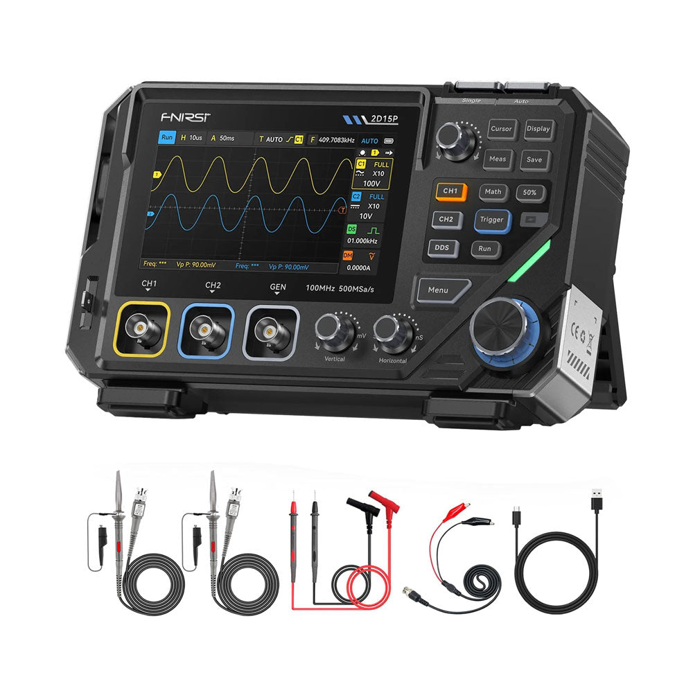The FNIRSI 2D15P is a compact 3-in-1 test tool combining a 2-channel digital oscilloscope, True RMS multimeter, and waveform generator in one device. With a 4.3" capacitive touchscreen, 100 MHz bandwidth, 500 MSa/s sampling rate, and up to 1,200 fps capture speed, it’s ideal for fast troubleshooting, signal analysis, and electronics testing.